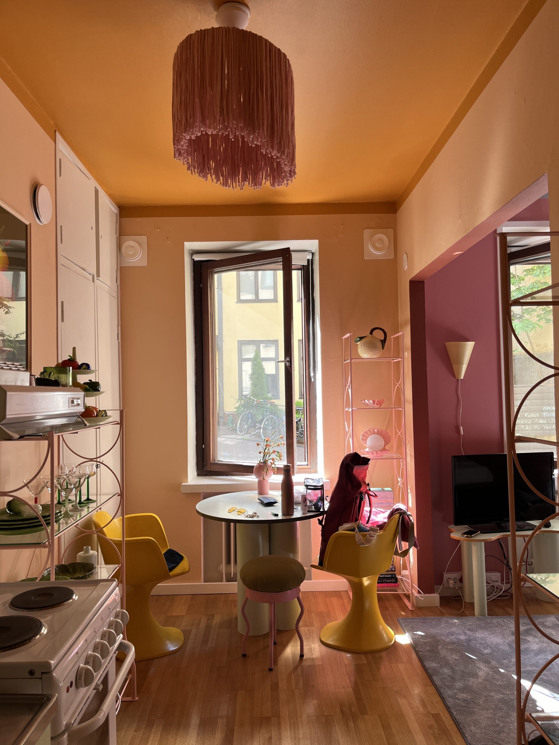 Pärast mõnusat lõunat võtsime ette ülesmäge matka korteri poole. Ma ei teadnudki, et Helsingi nii mägine on?! 15 minutit hiljem jõudsime vaiksesse juugendstiilis kvartalisse oma pööraselt värvilisse majutuskohta. Selline tunne, nagu oleks sisenenud Wes Andersoni filmi! Dušš pole kunagi mõnusam olnud. TT langes lõunaunne, mina hakkasin blogi toksima, sest ikka veel ei olnud und. Hiljem võtsime veel pika jalutuskäigu ette Hesburgerisse ja lõpuks maandusime kodu kõrval tänava äärses baaris veiniklaaside taha. Olime selleks hetkeks koos veetnud pikad ja värvikad 24 tundi ning läbi naeruturtsatuste ja lõputu aasimise oli näha, et kõigil on vaikselt silmad juba krõllis (Tiiul ka sõna otseses mõttes).
