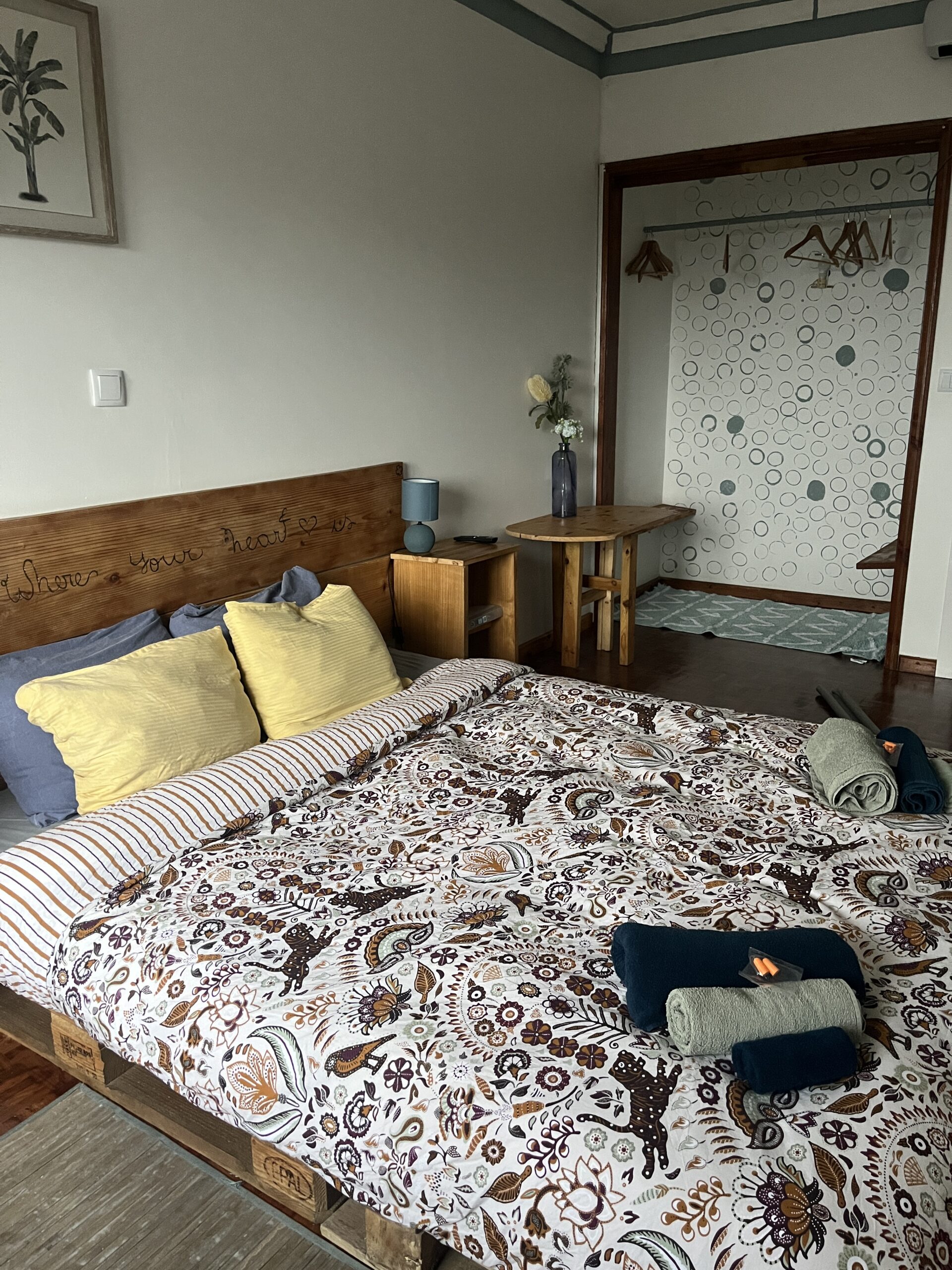 Majutuskoht nimega Handmade House Azores asus kiitsaka tee ääres poolkallakul madalas kahekordses erksinises majas. Tänu madalhooajale sain suure laia voodiga toa väga hea hinna eest. Majast üle tee oli korralik parkla, mis oli aga pilgeni täis, mistõttu pidin algselt auto tänavale jätma. See aga tähendas, et kui keegi nurga tagant kurvist vähe suurema lauluga tuleks (ja seda need kohalikud ka tegid), kihutaks ta mu suksule rõõmsalt tagant sisse. Õnneks aga sõitis viie minuti pärast juba üks auto parklast välja ning mina kasutasin kiirelt juhust ja napsasin vaba koha endale. Mitte kuskile ma siit enam täna ei sõida! Majake ise oli väga armas, paari üksiku toaga ning siseruumides tervitasid mind kaks valget kassi, Kanadast pärit vabatahtlik ning naabri aias kõrgusid lopsakad banaanipuud. Minu tuba oli ootamatult suur – seda juhtub harva, et päriselus on tuba/voodi suuremad, kui pildil – ning sisse oli ehitatud isegi midagi garderoobi laadset. Siia võin küll hea meelega jääda, õhkasin kergendunult. Vahepeal aga selgus kurb tõsiasi, et õhtusööki polnud mul kusagilt võimalik saada. Kohalikud poed ja restoranid olid kinni, suurem kaubanduskeskus jäi aga kõrvallinna 10minutise autosõidu kaugusele. Aga autosse mina keeldusin uuesti istumas! Kotis oli veel poolik Snickers ning ühisköögist suutsin õnneks siiski leida mõned munad, tomatit ja paprikat, mille eelnevad külalised oli endast maha jätnud.