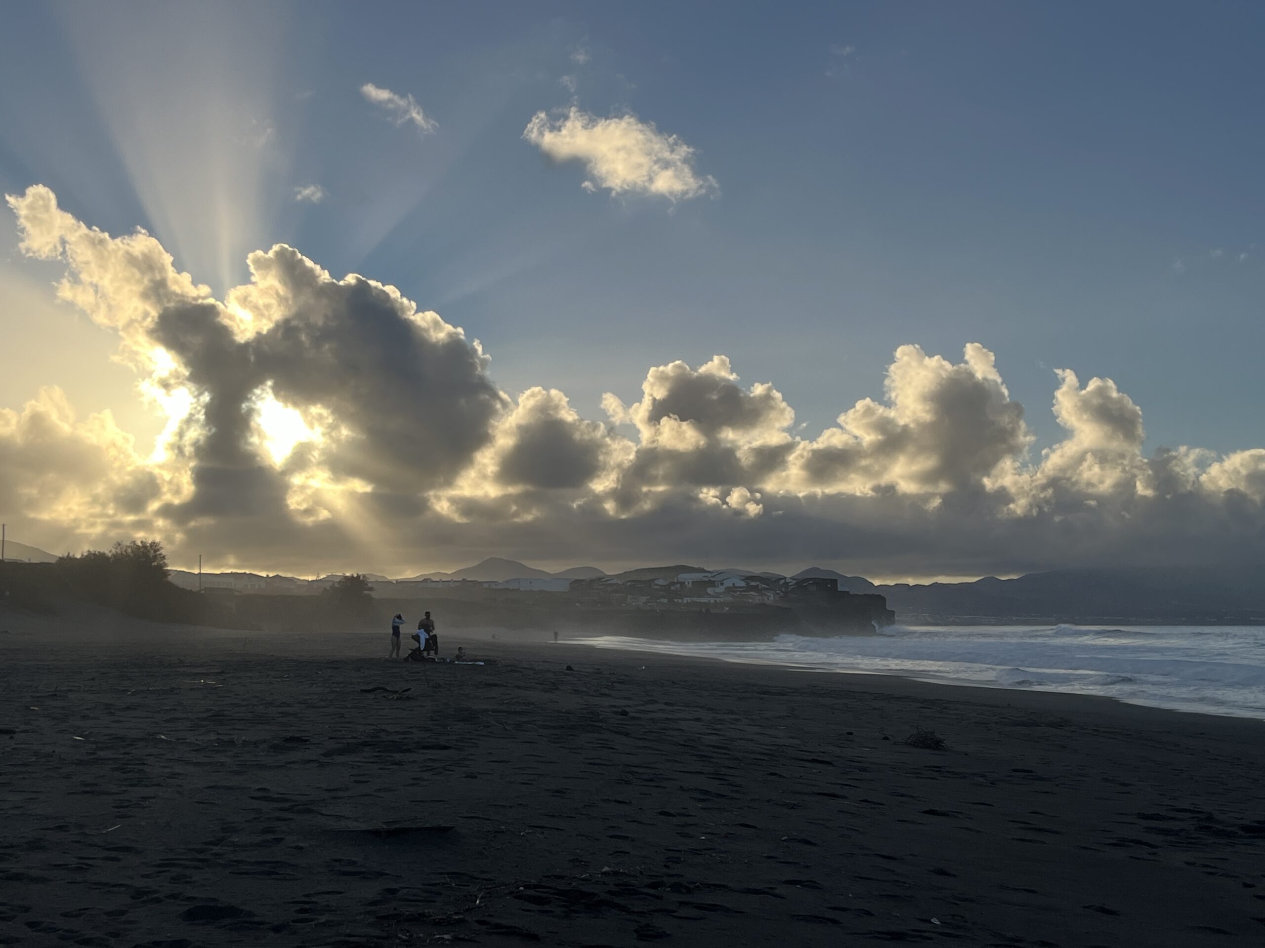 Enne kojuminekut oli vaja veel toidupoest läbi käia, seega põrutasin nüüd otseteed Porto Formosose kõrvallinna Ribeira Grandesse suurde supermarketisse. Kell oli selleks hetkeks viis õhtul, seega päike polnud veel loojunud, vaid siras muretult taevas. Kuna auto oli turvaliselt parklas, otsustasin toidukraami autosse jätta ja hoopis kohalikku randa jalutada. Tundsin Ribeira Grande tänavatel jalutades järsku üheaegselt nii rõõmu kui pettunud. Tegemist oli just sellise mõnusa surfilinna vaibiga, mida olin Assooridele tulles taga ajanud! Ja nüüd siis, oma siinolemise viimasel õhtul alles avastan selle mõnusa ja idüllilise ranna. Vulkaaniliival aeglaselt trikood selga sikutades ja mäslevate lainetega võitlevaid surfareid lummatult vaadates mõistsin, et oleksin võinud lihtsalt terve oma puhkuse siin veeta ja eluga palju rohkem rahul olla, kui stressates mööda saart kimades. Aga ma ju ei teadnud! Tegin siin oma puhkuse ainukese sulpsu, sest ujumiseks seda nimetada ei saanud – laine ja hoovus olid nii meeletu jõuga, et sain ainult ettevaatlikult hulpides tasa ja targu laineid ületada. Kes ookeanit ei tunneta, sel selles rannas küll vette asja pole! Imasin sisse veel viimase sõõmu päikseloojangut ning jalutasin paljajalu tagasi parklasse.