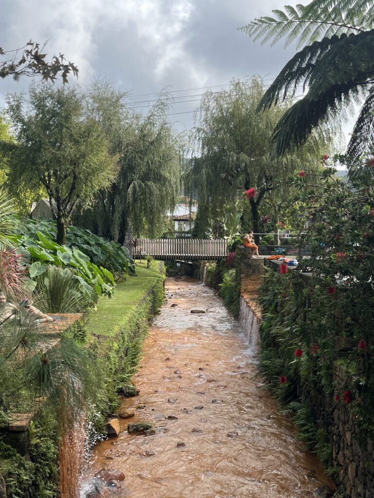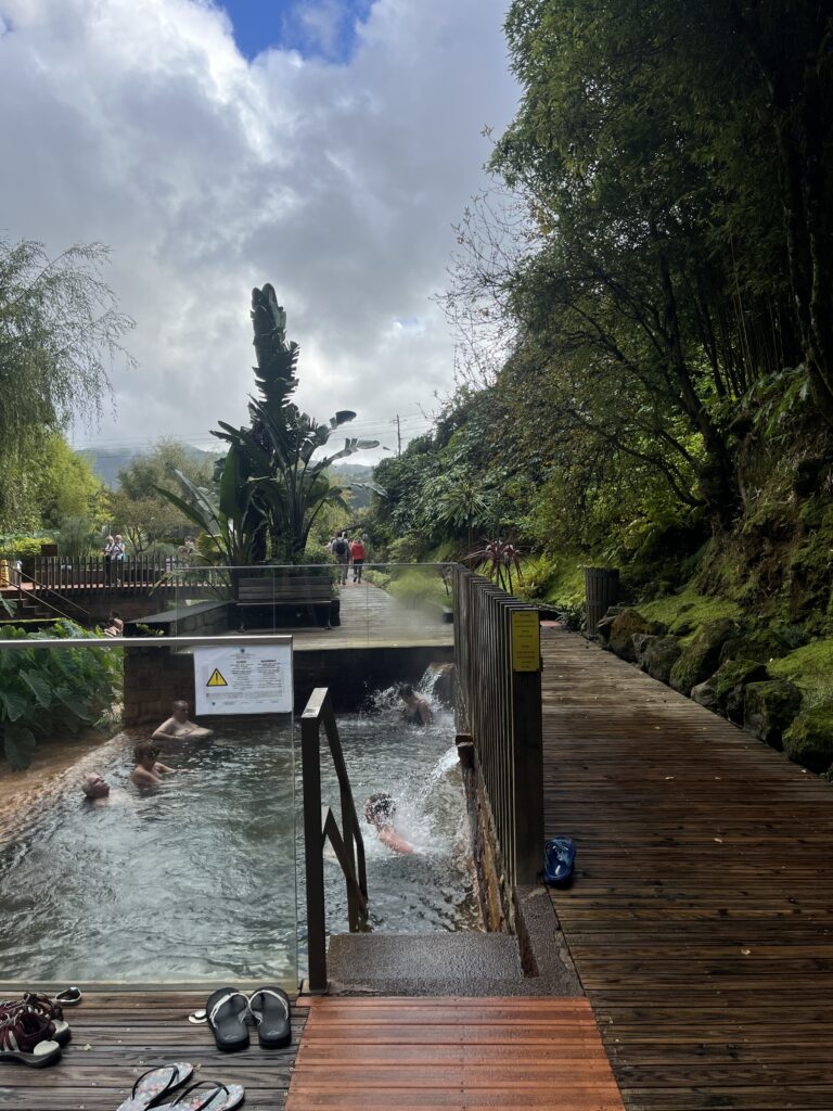 Seejärel võtsin suuna Furnase linna kurviliste teede poole, kus auto võimed said jälle proovile pandud. Pärast lühikest ekslemist linnakese kiitsukestel tänavatel keerasin lõpuks Poca de Dona Beija spa parklasse. Selliseid termaalbasseinidega pargikesi või keskuseid on Sao Migueli saarel mitmeid, kuid Furnase oma osutus mulle hinna ja asukoha suhtes kõige sobivamaks. Oluline on piletid enne internetist ära osta ja endale ajaaken broneerida, sest kohapeal müüki ei toimu. 8€ eest sai sissepääsu 90 minutiks, ligipääsu külmale dušile ja korvi, kuhu oma isiklikud asjad panna. Kõige muu, sh lukuga kapi ja sooja vee eest tulnuks juurde maksta. Säästureisijana olin loomulikult eeltöö ära teinud ega kavatsenud ühegi lisaliigutuse eest rohkem raha välja käia. Piiksutasin väravas oma QR-koodi läbi ja olingi sees. Poca da Dona Beija oli oma olemuselt nagu väike botaanikaaed, kus väiksel õuealal lopsaka roheluse keskel voolas roosteses sängis jõeke ning sellest kahel pool paiknesid neli mõnusalt sooja basseinikest naturaalse termaalveega. Suundusin kõigepealt kabiini riideid vahetama, asjad toppisin korvi ning katsin pealt vihmajopega, sest taevaluugid siiski avanesid aeg-ajalt ning nende riietega oli vaja ju terve päev vastu pidada. Kuna õuetemperatuur oli üsna sügisene (nii 17-18 kraadi), ei olnud trikoo väel ringi tatsamine ja külma duši alla ronimine just teab mis mõnuelamus, kuid paraku tuli enne kuuma basseini libisemist end siiski loputada. Vesi basseinides oli kõrge rauasisaldusega, mis tõttu võis mitmes kohas lugeda silte, et blondeeritud juukseid ei soovitata vette kasta ning et on oht ujumisriided ära määrida.