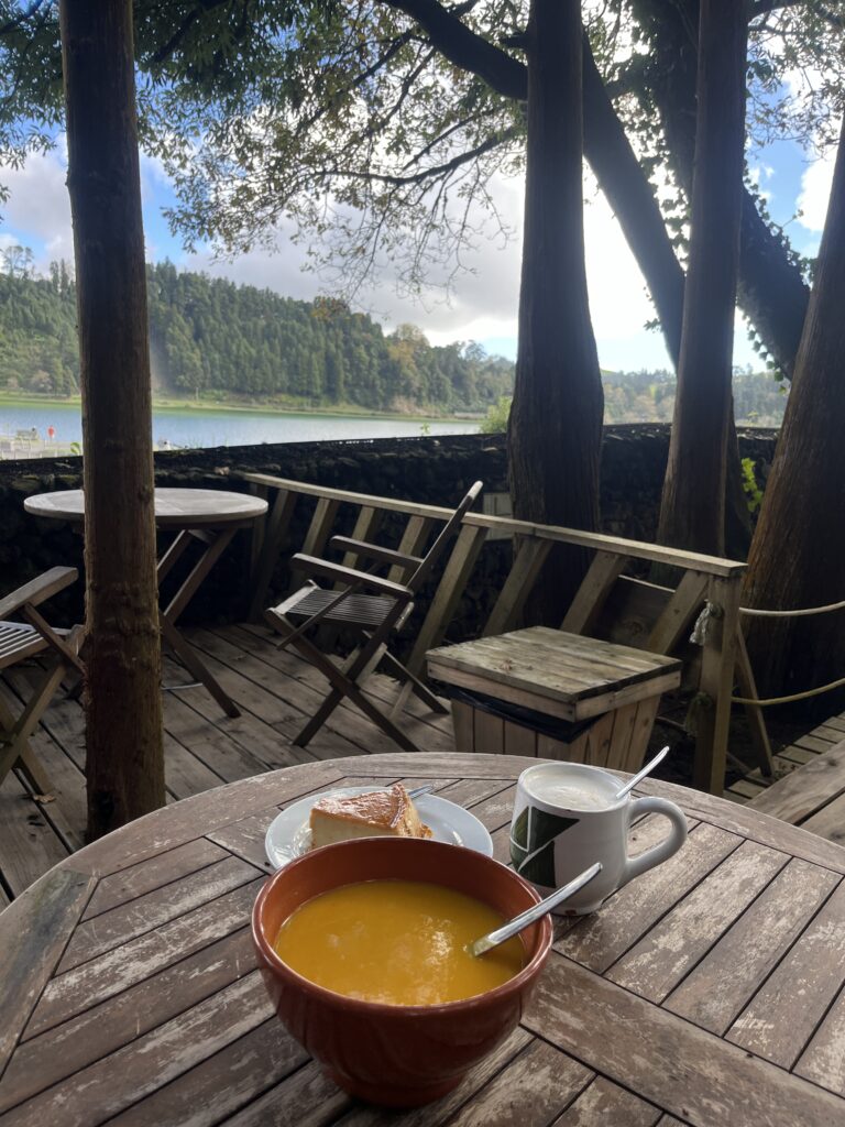 Tippisin ettevaatlikult esimesse basseini, kus temperatuur oli paitavalt soe, toetasin pea kiviäärele ning lasin end täiesti lõdvaks. Seal soojas heljudes oleks võinud end loodushelidesse ja veekohinasse täitsa ära kaotada, kuid minu suureks “rõõmuks” ei lasknud valjult naervad ja lobisevad portugallased sellel juhtuda. Ühel suurel naisel rippus telefon ka veel veekindla kotiga kaelas. Huvitav, kuidas inimestel on erinev arusaam lõõgastumisest. Mõne aja pärast hakkas pea juba natuke liiga kergeks muutuma, seega ronisin jaheda õhu kätte jahtuma. Niiviisi basseinist basseini kulgedes möödus poolteist tundi üsna kiirelt. Loputasin end lõpuks hoolikalt külma veega puhtaks ja vedasin oma rammestunud keha autosse. Nüüd oleks tahtnud lihtsalt auto tagaistemele magama kerida, kuid mul oli vaja hoopis kuskilt lõunasöök välja võluda. Või noh, mis võluda, kohale sõita, sest koht oli mul tegelikult ju välja valitud. Seal samas paari kilomeetri kaugusel asus Furnase järv, kus kuuldavasti pakutakse muuhulgas ka kuulsat vulkaanilises maapõues küpsetatud pajarooga Cozido das Furnas. Internetis oli see koht kuulutatud kalliks turistilõksuks, seega olin nõus kuulsatest roogadest loobuma ja leppima mõne lihtsama kõhutäiega. Minu üllatuseks peatas üks naine mu auto aga järvekaldal kinni – selgus, et parkimise eest tuleb siin maksta JA KOHE. No eriti tobe, aga ega mul midagi üle jäänud. Nemad nii lahkesti aktsepteerisid ka kaardimakseid. Parklas õnneks ruumi jagus, seega parkisin oma põrnika ära ja asusin kohvikut otsima.