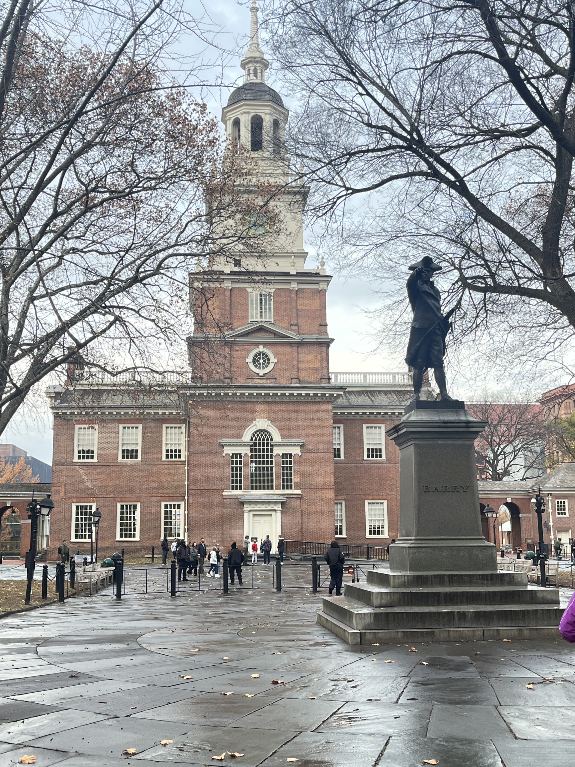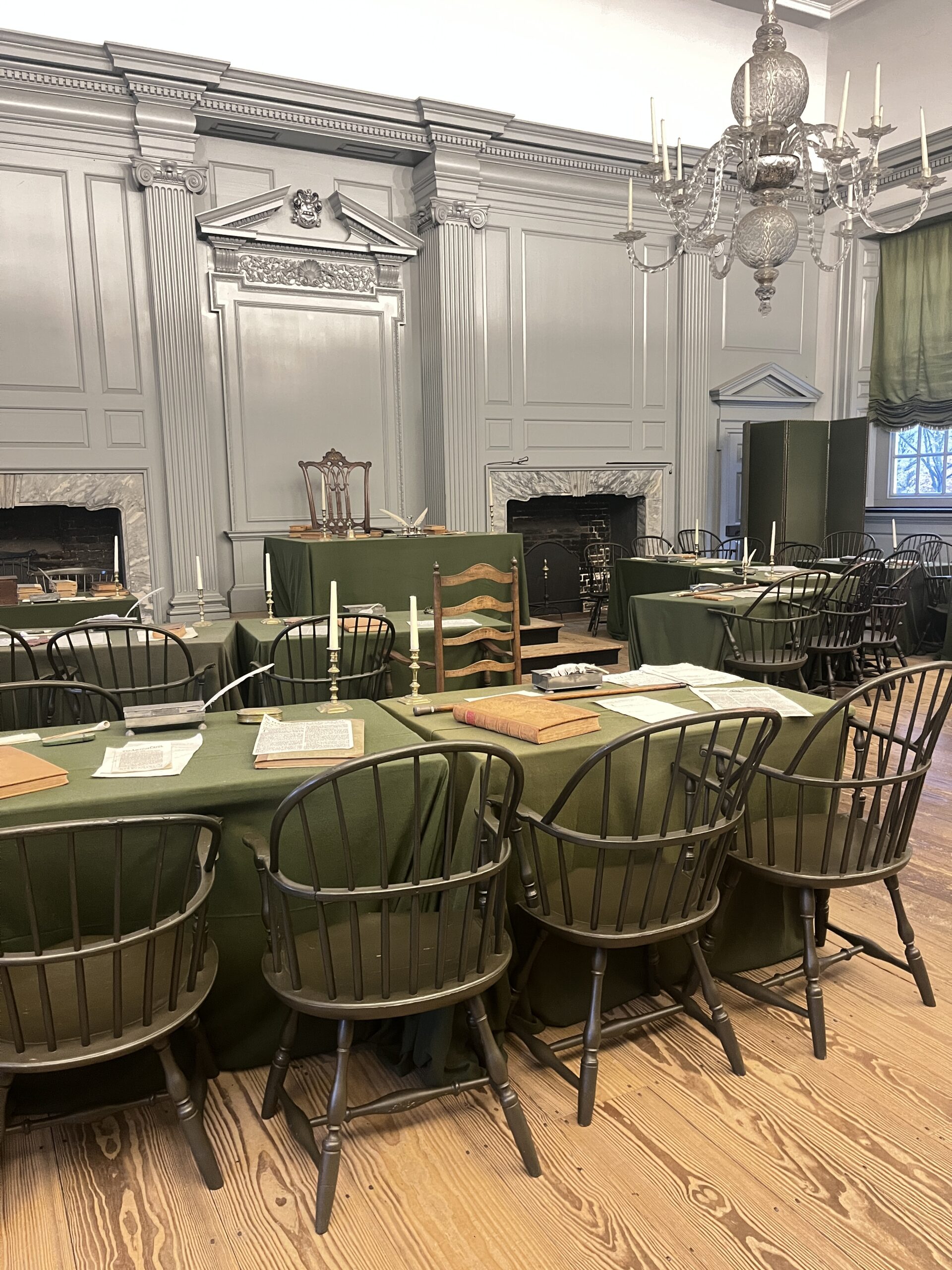 Tegemist oli väga naljaka ootealaga, mis oli lindiga ümbritsetud ja kus tuli lihtsalt seista. Lõpuks saabus meie giid, kes oli trullakas habemega vanamees, kõva hääle ja omapärase huumoriga. Kui ma ütleks “mõtle USA”, siis too mees tõenäoliselt oleks täpselt see, mida sa oma vaimusilmas ette kujutad. Tema lõunaosariigi aktsent oli samuti kümnesse, nii et mulle tundus, nagu ma jälgiks mingit filmikarakterit. Liikusime siis selle kambaga, keda polnud üldse vähe, hoonesse, kus 1776. aastal allkirjastati iseseisvusdeklaratsioon. Maja oli seest kaunis, kõrgete lagedega ja üleni puidust. Ega seal tõesti ilma giidita poleks palju teha olnud, sest mingeid kirjeldusi või märgistusi kuskil polnud. Mees etendas meile praktiliselt terve ajaloolise sündmuse üksi ette – kes kus istus, kuidas reageeris, mida ütles. Tuleb välja, et tol ajal polnud see mingi suur sündmus, sest ega osariikide esindajad ei teadnud, et tegemist saab olema üliolulise sündmusega Ameerika ajaloos, enamik ei viitsinud end isegi selleks kohale vedada ning mitmed kubernerid, kellel olid soojad suhted brittidega, polnud üldse huvitatud iseseisvumisest. Ringkäik oli väga huvitav, kui seda poleks rikkunud üks juudipere oma viietuhande lapsega, kes lihtsalt lampi lärmasid, nii et giidi kuulmine oli vahepeal raskendatud. Ülemisel korrusel lasti meid laiali nagu lambakari. Taustaks pandi käima muusika ning öeldi, et kui muusika lõppeb, on tuur läbi ja tuleb jalga lasta. See tekitas lapsepõlvele sarnast mängulist ärevust, sest kust mina tean, kui kaua ma nüüd võin ühe või teise vaatamisväärsuse juures peatuda – äkki jäävad teised asjad sellepärast nägemata?!