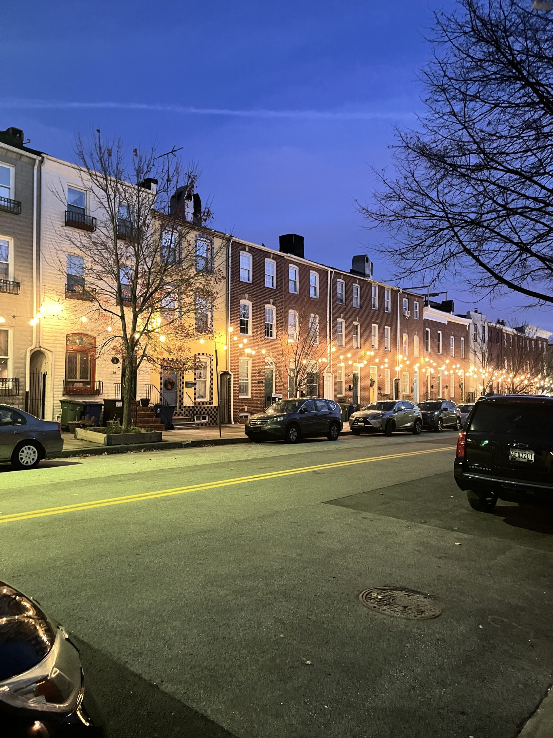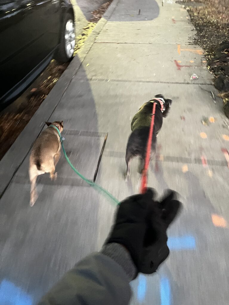 Pärastlõunal ronisime kõik uuesti alumise korruse diivanile teleka ette kaisutama. Missy ronis mulle kohe hästi-hästi põue, mis oli nii armas, ainult et ma pidin teda katkematult paitama ja sügama, muidu ta ärkas üles, jõllitas mulle pettunult otse silma sisse ja lasi kuuldavale haliseva kaebuse või kui ma teda korrale kutsusin, kasutas passiivagressiivset külgpilku. Õhtul otsustasin neid veel korraks jalutama viia, et vähendada üldist rahutust ja nende energiat kulutada. Sel korral otsustasin proovida mõlemaga korraga jalutamist ja kae imet – kahe koera haldamine osutus oluliselt lihtsamaks kui ühe! Nagu ma mainisin, siis käitusid nad nagu kaksikud ehk allusid käsklustele korraga ja korrigeerisid oma käitumist paremini. Kui ma nüüd sikutamise peale seisma jäin, tagurdasid mõlemad koerad ühtlase tempo hoidmiseks. Ka ootamine ja istumine tuli neil paremini välja. Ainuke olukord, kus kahe haldamine osutus väljakutsuvaks, oli siis, kui kumbki neist kakas. Missy tahtis iga kord kiirelt edasi liikuda ja polnud sellest ootepausist eriti huvitatud, Kira suutis end aga ümber mu jalgade sõlme kõndida. Võtsin alguses suuna kaardilt paistva suure pargi suunas, mis pidi olema justkui Baltimore’i Central Park, kuid paraku oli see jalgsi oluliselt kaugemal, kui algselt paistis, õues hakkas pimedaks minema ja loomadel tundus ka külm olevat. Seega tegin otsuse ühele imeilusale tulukestega alleele pöörata ning meie ring veidi lühemaks lõigata. Tänav ise oli kaunis, kuid sattusin mingisuguse sagimise sisse, kus parasjagu tänaval toitu laiali jaotati ning mina leidsin end taas ainsa ja igati väljapaistva valgena. Mind saatsid jõllitavad pilgud, kuid Missy ja Kira pehmendasid naabruskonna elanike põrnitsemise muhedaks naeratuseks. Eriti tegi neile nalja, kui Missy ühe prügikastist välja kukkunud fooliumtaldriku kallale hüppas ja ma siis kurja vaeva nägin, et teda sealt minema tirida. Noh, hea küll, võin naerualune ka olla.