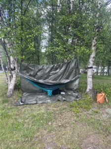 Asume siis Niklasega Göbetorgist oma väiksele matkale ööbimiskohta, kui selgub, et ka Niklas suundub homme Abiskosse. No ei ole võimalik! Kuna nädalavahetuseti tundub sinna suundumine üsna keeruline, uurisin kohe, kuidas mu uus sõber sinna minna kavatseb. Tuleb välja, et päevas väljub sinna kaks bussi. No näed, siis järelikult lähen ka mina homme bussiga Abiskosse. Kõndisime mööda üleskaevatud teed, kus olid püsti jämedad traadid ja trossid. Üllataval kombel ei ole seljakoti raskust üldse tunda, kui on, kellega samal ajal juttu puhuda. Kohale jõudes läks Niklas oma hostelisse, mina aga hakkasin uurima, kas on võimalik telklasse võrkkiike üles seada. Leidsin kaks tugevamat kaske lõkkeplatsi lähedalt, maksin oma 22€ ja asusin magamistuba ülesehitama. See osutus veidi raskemaks ülesandeks, kui ma arvasin, et sest 3 x 5 m presentkatet üksi üles riputada on paras väljakutse. Tundsin kuklas Rootsi pensionäride puurivaid pilke, kes rahulikult oma karavanide ees matkatoolides istusid. Küll üks neiu võib ikka palju lärmi tekitada.