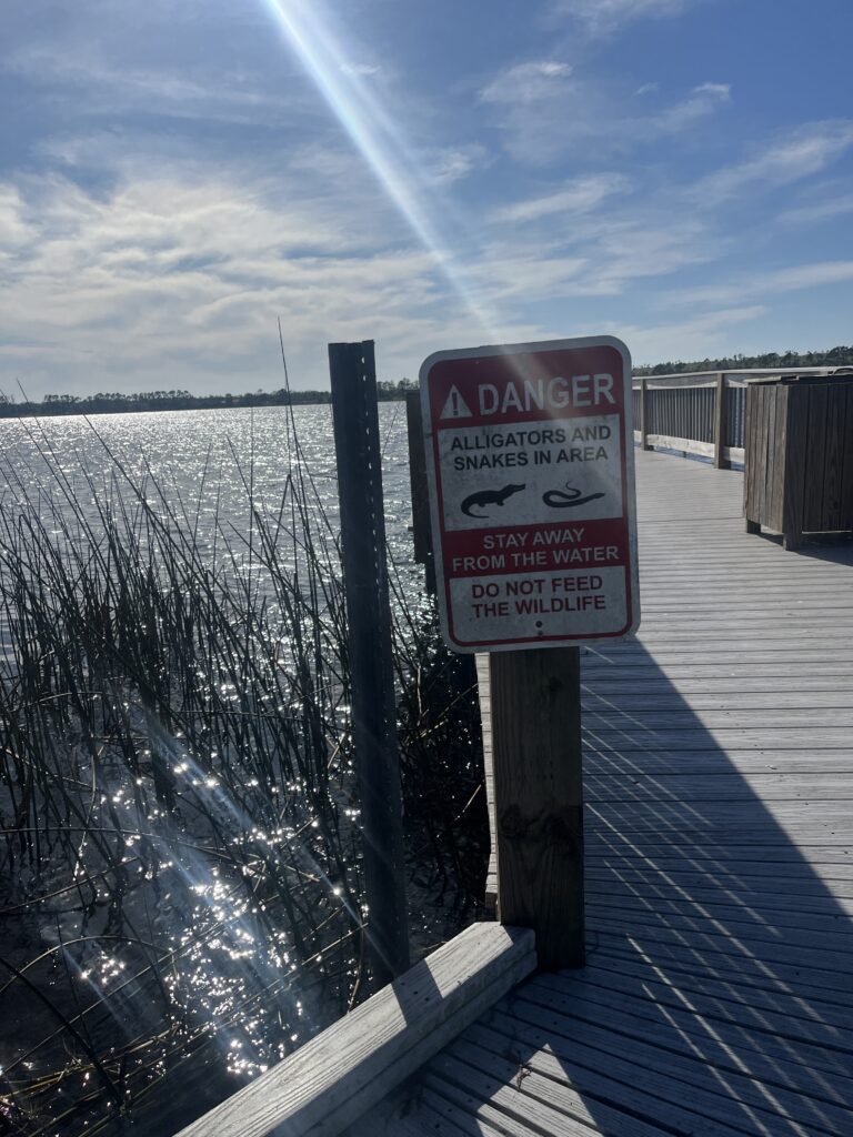 Tagasi kodus, otsustasime väiksele jalutuskäigule minna. Mina tahtsin nii väga alligaatoreid näha ja kuna Bradentonis võis neid väidetavalt üsna hõlpsalt kohata, läksime u 20minutisele jalutuskäigule kohaliku järve äärde. Pean tunnistama, et kuigi me kõndisime sinna mööda elamurajoonide vahelist kõnniteed, tekitasid teeäärne troopiline võpsik ja kraaviperv minus juba veidi närvikõdi. Järve äärde pani parasjagu bändi püsti ning kohalikud olid end matkatoolidesse õllepudelitega sisse seadnud, kuskil eemal tundus toimuvat mingi säästupulma moodi piknik ning kogu selle sebimise vahel kõndimise meie ja teised tavapärased pühapäevakõndijad. Sandra muidugi kõnetas kõiki vastutulijaid nagu ameeriklased ikka ja küsis pisikeste nähvitsatega jalutajate käest, et kas nad tõid alligaatoritele suupisteid või. Kõmpisime seejärel mööda laudteed sillani, mina samal ajal peksleva südamega mõlemale poole tumedasse vette põrnitsedes, sest Sandra sõnul olevat just selline pilliroostik sobiv peidupaik krokodele. Paraku minu õnneks või õnnetuseks me täna kedagi ei silmanud. Ilm oli muideks viimastel päevadel olnud harukordselt külm. Ja ma ei tee nalja – see 15-16kraadine ilm keset Florida troopikat oli hingematvalt näpistav ja kõle. See tähendas aga, et krokod olid ju vee sees peidu – päikse kätte tulevad nad end ainult soojendama. Tagasiteel märkasin aga ehmatusega kaugemal ühe sillaposti taga ühte veidrat krobelist sabaotsa. Jõllitasime seda Sandraga kaugelt ning jõudsime järeldusele, et tegemist vist on krokopojaga. Kuna poja aga väga ei liigutanud (ega alligaatorid üldiselt lamavadki liikumatult), otsustasime minna teda lähemalt piidlema. Hiilisime lähemale, kallutasime end ettevaatlikult üle silla äär piiluma ja… tegemist oli lihtsalt puurondiga.
