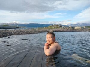 Ühel hetkel saabus Niklaselt sõnum, et tema on ka nüüd lõpuks bussiga Abiskosse jõudnud. Leppisime kokku, et läheme veel korra õhtul ujumiskohta otsima järve äärde, enne kui meie teed lõplikult hargnevad. Mina pidin kindlasti kella kaheksaks tagasi olema, sest ainult kella 20-21 vahel on võimalik valmisköetud saunamaja rõõme kasutada. Suikusin veel veidi toas, seejärel tegin endale tassi teed kaasa ning asusin jalutuskäigule järve poole. Niklas oli juba mulle täitsa vastu tulnud, vahetasime päevaseid reisimuljed – mina oma (eba)õnnestunud mägimatkast ja tema Kiruna uuest linnaosast. Järve ääres oli jäine tuul, uurisime erinevaid variante vette sisenemiseks, kuni otsustasime kellegi paadikuuri kasuks. Seal oli vette ehitatud puidust purre ja kuuri külje all istumiseks tuulevarjus pingike. Vesi oli selge, külm ja karge – temperatuurilt Eesti taliujumiseks sobilik, samas kuidagi pehme. Kuivatasime kiirelt oma punetavad jäsemed ning asusime päikse kätte istuma. Nii tore, nii mõnus.