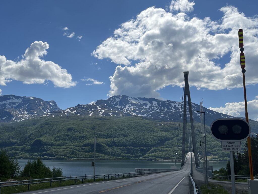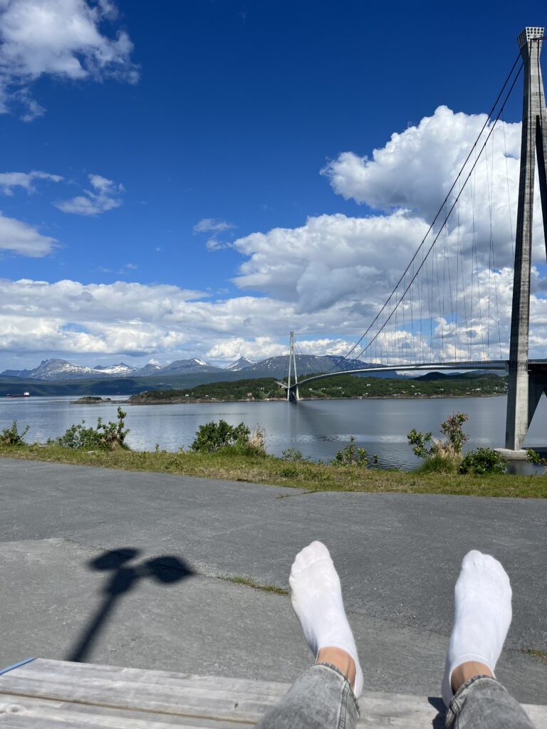 Jätkasin oma ristirännakut suure ja kuulsa silla suunas, mis õnneks oli varustatud eraldi jalakäijate alaga. Sild ise on uus, värske ja võimas ning 1,5 km pikk. Sealt edasi aga oli veel kolm kilomeetrit vaja marssida, sest pühapäeval puudub igasugune bussiliiklus siin riigis. Kott oli raske ja surus õlgadele nii kõvasti, et pea hakkas valust taguma. Sillale jõudes aitas vaade vähemalt halvalt enesetundelt tähelepanu eemale viia. Fjordid, mäed, lõputud vaated ja selle kõige all sini-roheline meri. Jõllitasin seda vaatepilti, pilgutasin silmi ja pomisesin omaette: “Okei, Norra, kas see on normaalne või? Kas see on üldse legaaaaalne, et üks riik selline võib välja näha? Natuke üle ei pinguta selle asjaga või?” Proovisin pildistada ja filmida, aga nagu ikka, pildile ei jää ju kübetki selles maagiast. Lõputu silla lõpus õnnestus mul pingile jalad siruli visata, tossud pikalt saata ning varbaid ja õlgu puhata. Pistsin ühe kaneelisaia ja peotäie pähkleid nahka ning kaanisin vett. Natuke veel, viimane pingutus.