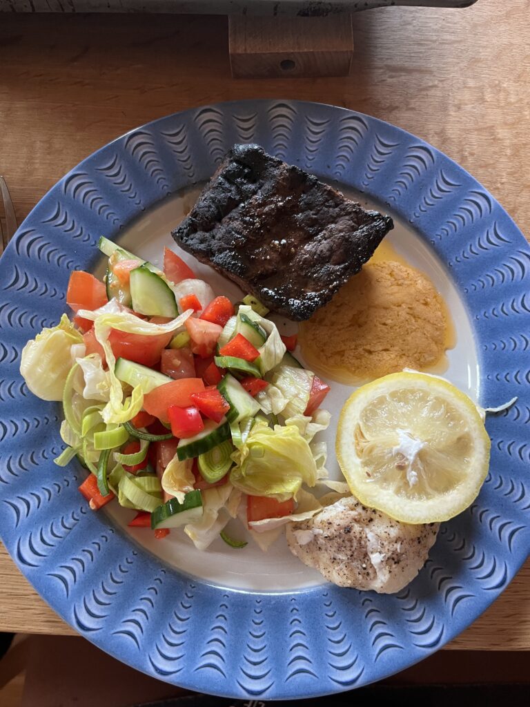 Järgmine päev, s.o kolmapäev on lõpuks meie päris viimane päev metsamajas. H oli eelmisel päeval rääkinud L-ile, et ta nägi mingit väga suurt kala, mis ta ära ehmatas – äkki oli halibut! Halibuti eestikeelne vaste on vist hiidlest. L naerab, sest ta on oma pika kalapüügikogemuse käigus ainult ühe korra halibuti suutnud kätte saada ja seda ka avamerel. H aga kinnitab, et me peame veel viimast korda minema kala püüdma, temal on selline “tunne”. Mis meil selle vastu saab olla! Sügavkülmas ootab meid täna õhtul vaalafilee – L oli neid poes näinud ja ostnud, sest kuidas ma siis niiviisi lahkun, et pole vaala söönud. Jällegi, mis mul selle vastu olla saab.