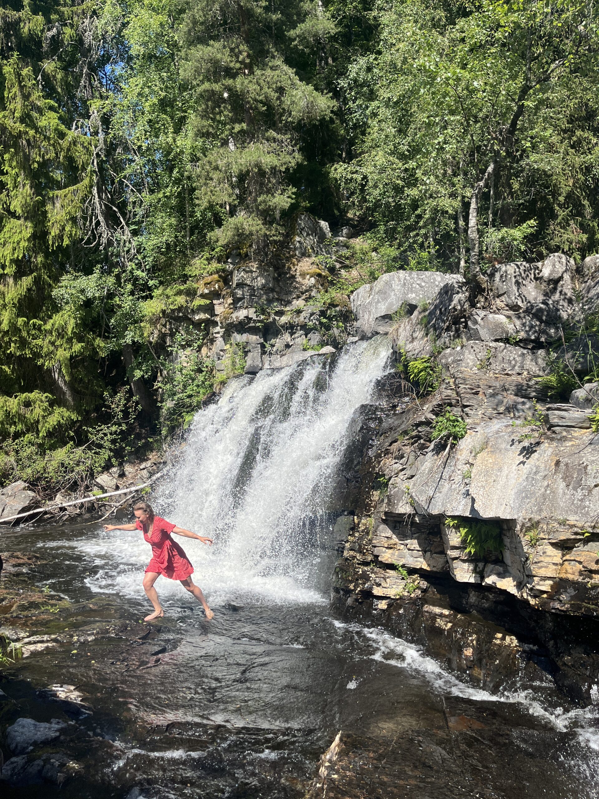 Üleval mäe otsas ei ole kahjuks midagi põnevat teha, vaade on muidugi ilus ja tore, aga kaua sa seda ikka vaatad. Otsustame ka alla sõita liftiga, elevust ikka täie raha eest. Hakkame olümpiakülast tagasi kõndima, kui järsku märkame tee ääres väikest rada puude vahelt minemas. Mingit silti ega viita ei ole, aga tundub, et midagi seal kohiseb. Astume mõnikümmend meetrit rada mööda edasi, kuni järsku jõuame imeilusa jõekese äärde, mis voolab väikeste koskedena alla linna poole. Täiesti suvaliselt, keset linna, ilma mingisugusegi märgistuseta! Võtame jalatsid ära ja sipsime ettevaatlikult paljajalu läbi vee, ise rõõmsalt kihistades. Nii vaikne, nii metsik, nii ilus. Teisel pool jõekest tundub olevat midagi linnametsa sarnast. Nagu oleks park, aga tegelikult on sügav kuusemets! Kõnnime veidi allavoolu, kuni jõuame täiesti vapustava vaatepildini – kahe astanguga juga kohisemas ja pahisemas ning mitte ühtegi inimest läheduses. Tipime suu ammuli ringi, kastame nägu ja juukseid kuumuse eest külma veega ning üritame mitte surnuks kukkuda, sest pinnas on ülilibe. Joome mõnusat külma vett, täidame pudeleid ja imetleme seda vapustavat loodust. Loomulikult teeme ka tuhat pildiseeriat, sest halloo! Sellist idülli ei saa ju ometi mitte jäädvustamata jätta – eriti, kui sul on ihufotograaf omast käest võtta. Pärast mõningast mõnulemist jätame kosega hüvasti ja jätkame teed allajõge, kuni jõuame linna keskele välja. Viskame end voodisse pikali ja puhkame jalgu. Minul on vahepeal õnnestunud endale Tinderis kohting saada samaks õhtuks. Ei ole küll päris selline viiking, keda ma olen otsinud, aga noh, pikk ja blond norra mees, kes väidetavalt on ka hiljuti töölt ära tulnud ja soovib Kanadasse reisima minna. Vähemalt on üks teema, millest rääkida, ja saab Norra nimekirjast maha kriipsutada.