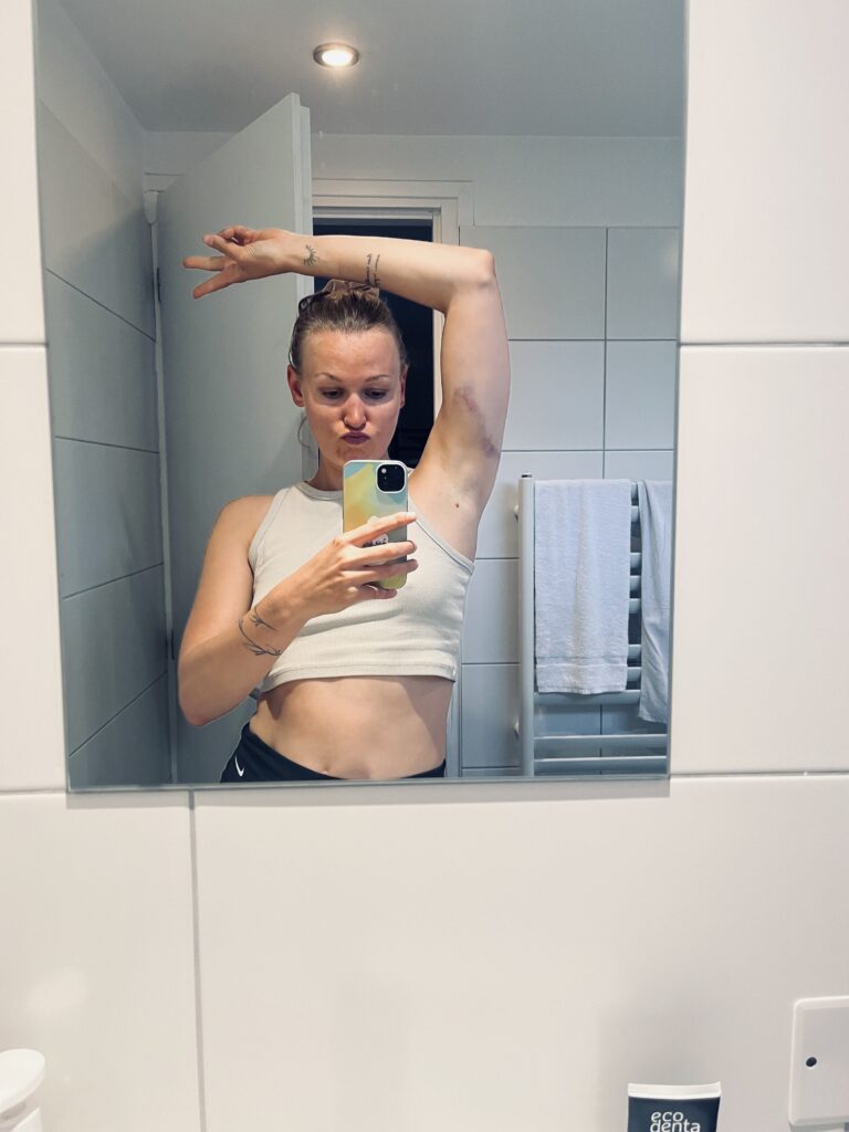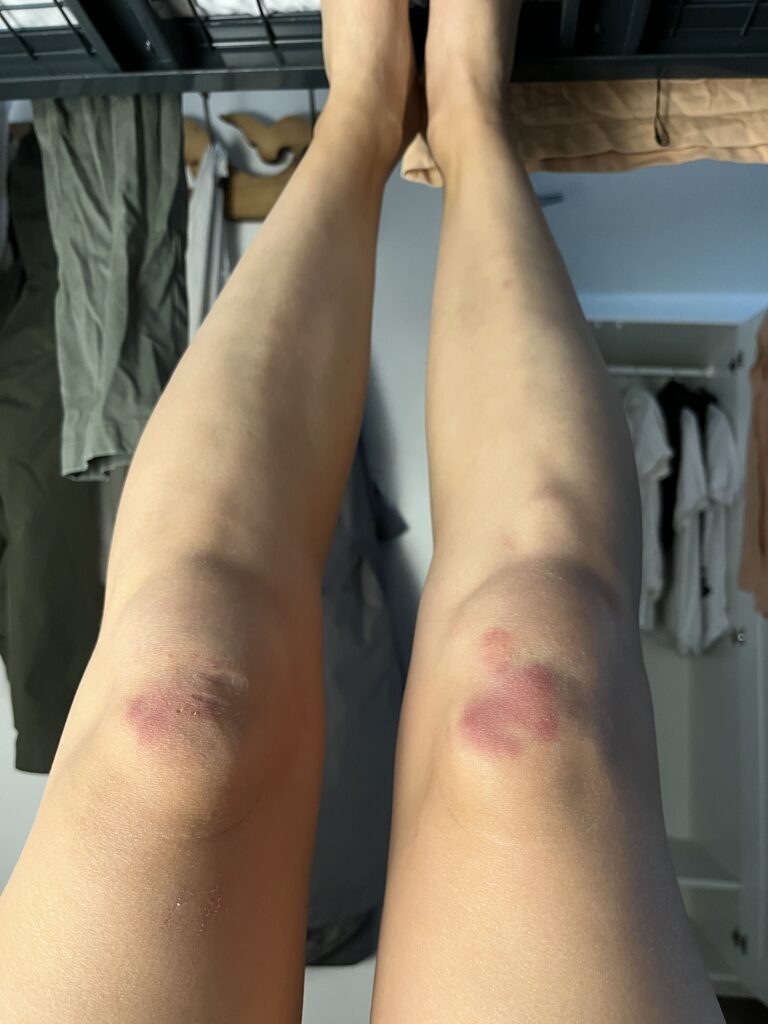 Korjan kokku kogu nänni ja kodinad, mida pakutakse, topin suhu kõike, mis sisaldab süsivesikuid, ja kaanin spordijooki peale. Ka energiajooke jagatakse, kuid see lendab pärast esimest lonksu prügikasti. Lonkan koju kasima ja sõjahaavu hindama. Kõige rohkem olen mures oma näo pärast – mis seal siis toimub? Noh, üks kaunis kuivanud mudane jalajälg laiutab mu silmnäos. Pärast pesemist jääb alles vaid pisike verevalum ninajuurel ja minimaalselt kriimune kulm. Täitsa inimese nägu. Jalgadel on tavalised ennustatavad sinikad, mida ornimine endast jätta võiks. Minu üllatuseks on mu parema triitsepsi peal aga laiutamas korralik verevalum, mis järgnevatel päevadel väga eriilmelisi värvitoone võtma hakkasbning mille tõttu pean käte üle pea tõstmisega väga ettevaatlik olema, et mitte koduvägivalla ohvri muljet jätta. Ma ütleks, et lahinguhaavad esindavad täiesti õigustatult ületatud väljakutse taset!