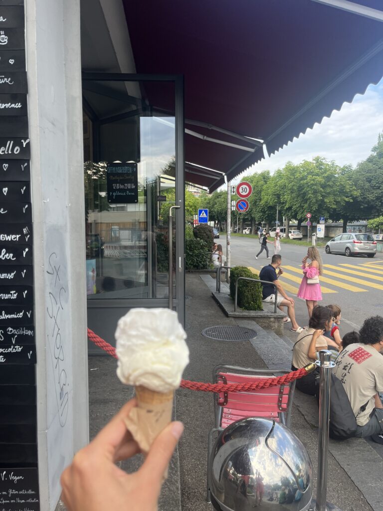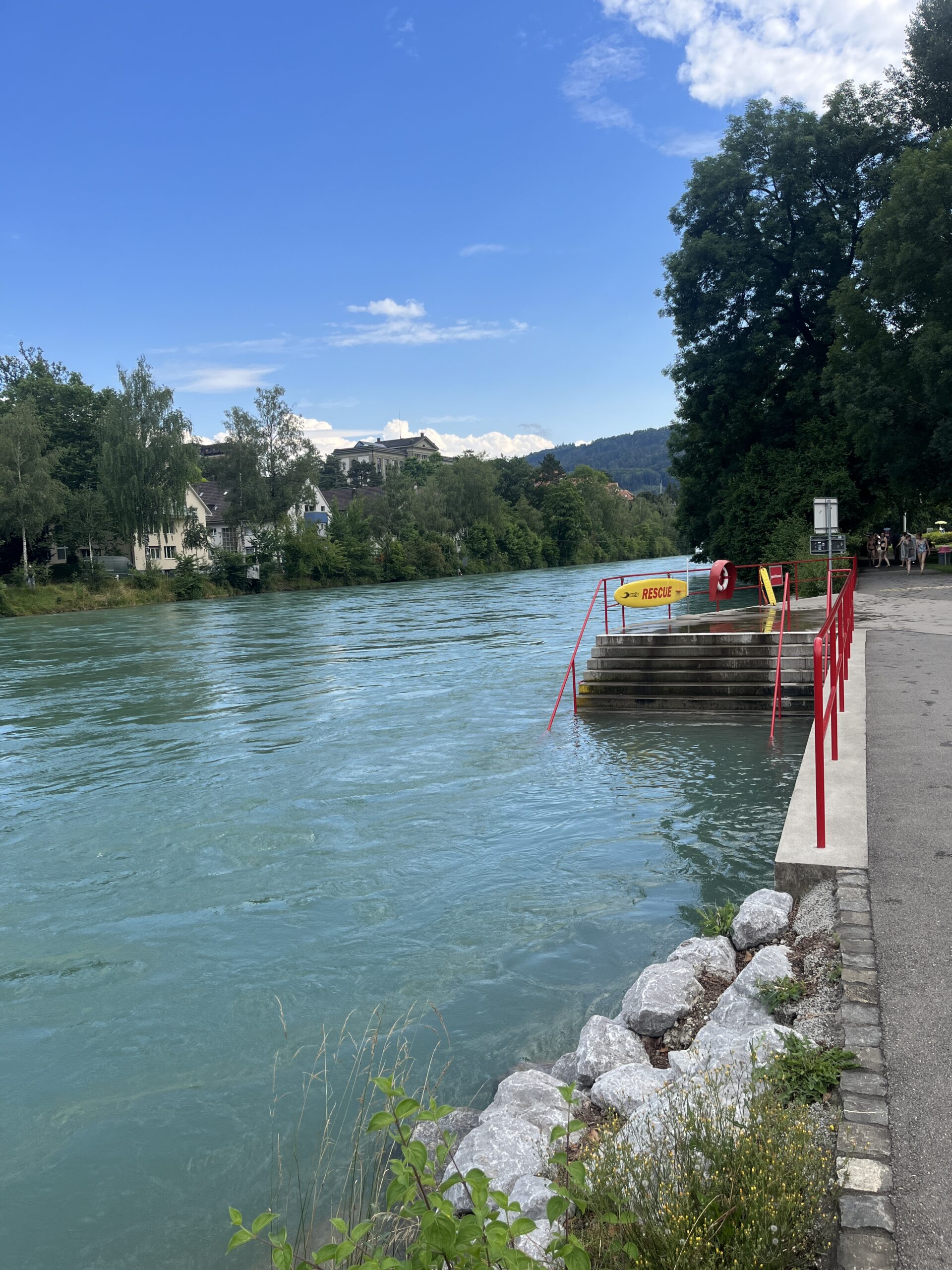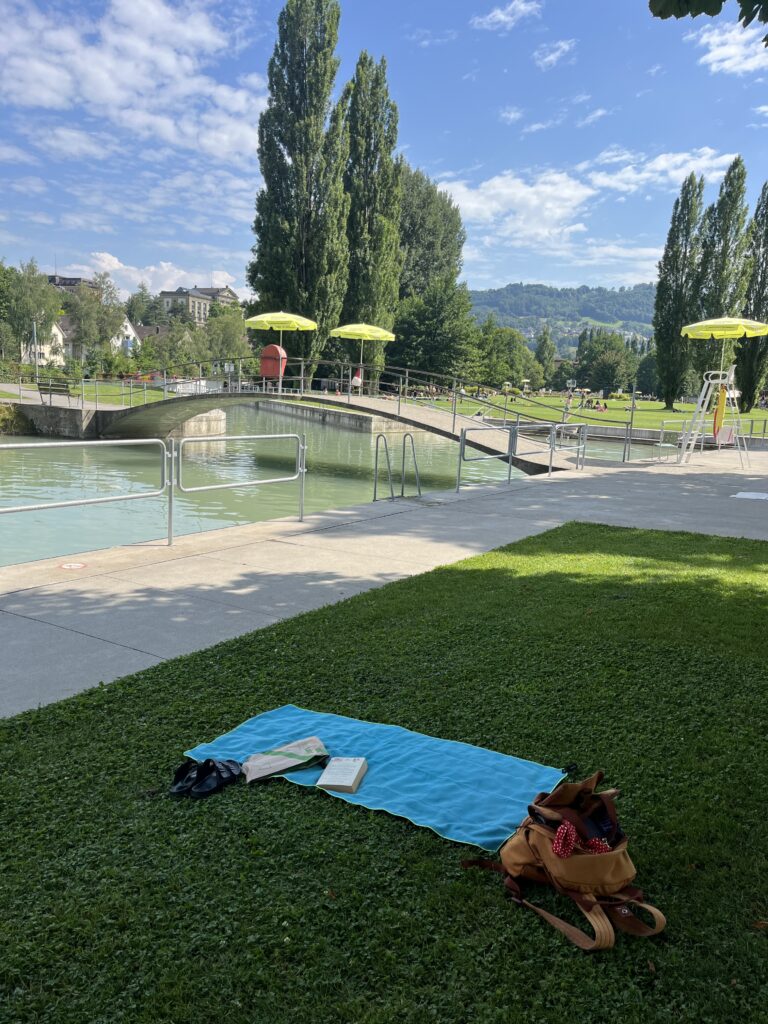 Pistan oma võiku nahka ja ronin siis kärsitult vette. Jõevesi on piimjalt hägune ning üllatavalt külm. Mitte selle pärast, et ma külma vett pelgaks eksole, vaid mul on olnud võimalus vaadelda nii vanamemmesid kui lapsi selles vees pikalt ulpimas, nagu tegemist oleks vanniveega. Mina teen ühe kiire ringi ja ronin välja rätikule kuivama. Loen mõnda aega raamatut, kuni tekib huvi jõge kaema minna. Enne seda kaardistan ümbrust – ma ei viitsi oma kotti ja rätikut hakata kaasa vedama, kuid kui ma jõkke lähen, puudub mul igasugune vaade oma varale. Minu kõrvale on tulnud neiu, kes loeb samuti raamatut, ning eemal pingil istub vene vanaisa, kes lasi enne oma lapselapsele klassikalist muusikat telefonist. Kui ma muusika peale oma pilgu raamatult tõstsin, hüüdis vanapapi: “Ma ainult korraks lasen talle, ühe minuti!” Muigasin üllatunult, sest üldiselt ei kipu inimesed niiviisi hoolima ja ega ma polnudki otseselt häiritud millesti. See oli igatahes väga armas žest ja mul polnud kahtlustki, et võin selle seltskonna pilgu alla oma koti vedelema jätta. Kesklinn küll, aga saksakeelne Šveits ju!