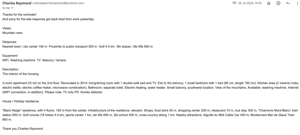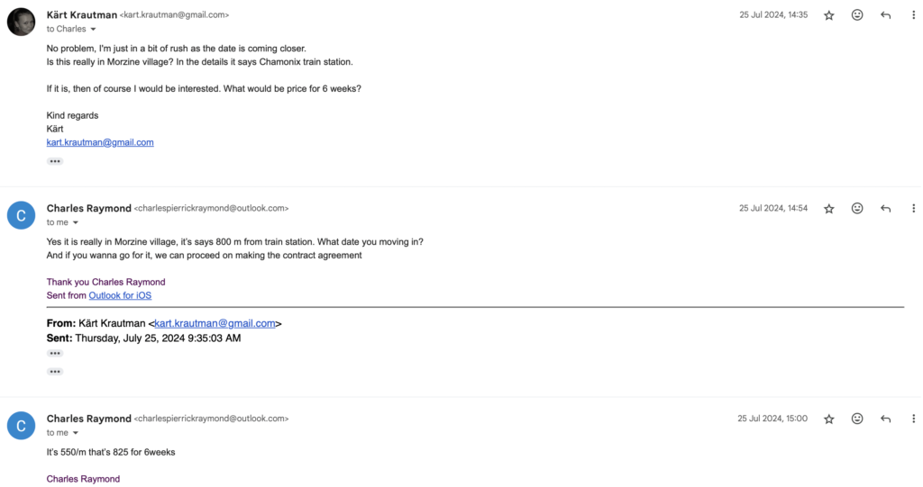Jah, loomulikult võib olla, et inimesed panevad oma üürikorterid vahepeal Bookingusse või AirBnb’sse üles, aga ma eeldaks korteriomanikult pigem kirja stiilis “kahetoaline korter, aadress, üürisumma, lisakulud, ettemaksu summa”. Siin on aga nii palju infopahna, kuid korteri aadressist ega hinnast pole mingit juttu. Pildid on muidugi ilusad ja professionaalsed. Kõige kriitilisemalt tõmbab aga minu tähelepanu “Chamonix Mont-Blanc train station 800m“. Ärge palun sellist jama mulle küll rääkima tulge. Kui Morzine’is oleks rongipeatus, küllap ma siis sinna oleks ka rongiga sõitnud! Rongirööpad pole aga sinna kanti teps mitte sattunud. Ja üldse – Chamonix Mont-Blanc asub Morzine’ist pooleteise tunnise autosõidu kaugusel. Tundub kahtlane, kuid mulle meeldib siiski anda inimestele võimalus end selgitada. Võib-olla tuli kopeerides viga sisse, võib-olla on härral mitu üürikorterit. Roosad prillid võtan aga eest ja panen ära karpi. Proovin härrat guugeldada, kuid nimi on liiga levinud ja konkreetseid vasteid ei tule. Kirjavahetus kulgeb edasi järgnevalt: