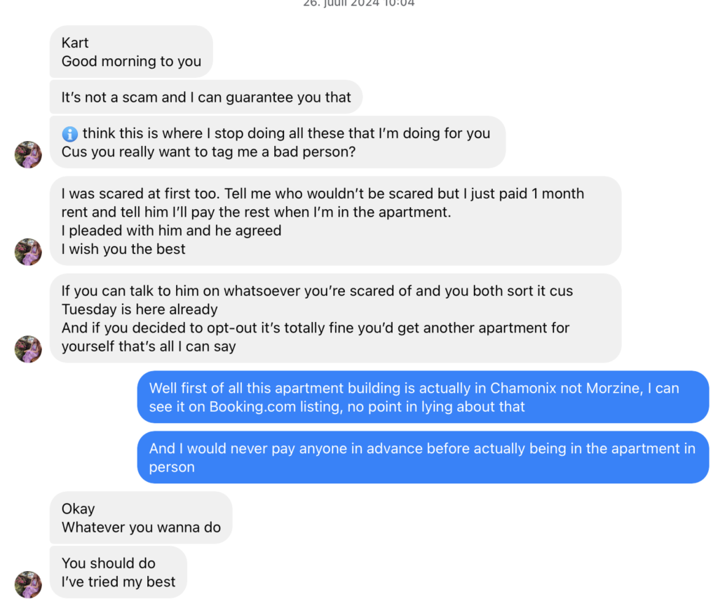 Nagu näha, siis härra jääb oma jurale kindlaks, ning kinnitab, et jaa-jaa, korter asub Morzine’is ja rongipeatus jääb 800 meetri kaugusele. Hind on muidugi täpselt minu eelarvele sobiv – alla 900€. Hiljem saan teada, et selle summa eest ei saa Morzine’is tubagi rentida, rääkimata kahetoalisest korterist! Kirjavahetuses liigume üürilepingule aina lähemale, kuid mina pressin igas kirjas ikka edasi, et selle rongipeatusega on siin mingi kala. Härra kinnitab, et kala ei ole, kõik on õige. Samal ajal ilmub nagu tellitult ka preili Keira Facebookis minu postkasti ja kinnitab, et tegemist on väga hea korteriga ning et annaksin talle teada, kui mul on mingeid küsimusi. Noh, nüüdseks olen ma juba aru saanud, et tegemist on 100% pettusega. Mis mulle aga rahu ei anna on see, et miks need skämmerid nii lollid on ja taustatööd ei tee. Kuidas sa nii lihtsa asjaga vahele jääd?! Ma suudaks ise palju parema pettuskeemiga lagedale tulla. Üritan alguses härra Raymondit nurka suruda faktidega, kuid tema ajab vankumatult oma valet edasi. Järgmiseks võtan ette neiu Keira (kes sarnase lakoonilise kirjapildi alusel ei ole keegi muu kui “härra Raymond”) ning kirjutan talle, et äkki oleks aeg oma pettus ausalt üles tunnistada, sest mõnel meist siin on päriselt vaja loetud päevade pärast reaalselt eksisteerivasse korterisse sisse kolida. Seejärel saan mitmed pikad sõnumid, millega neiu/härra end ilmselgelt paljastab, sest miks peaks mingisugust endist üürilist nii kirglikult huvitama, kas sa võtad korteri üürile või mitte. Eriti, kui see korter on saadaval nii nõutud piirkonnas, kui seda on Morzine.