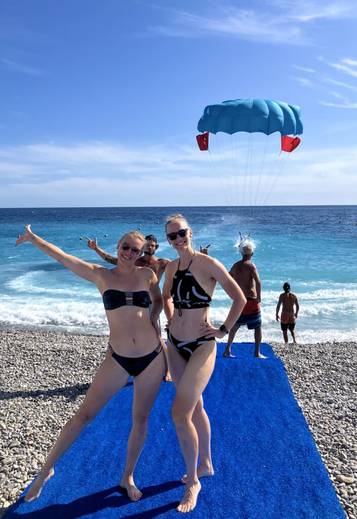 Kuuendal päeval olen mina jätkuvalt merehaige. Otsustame, et tahaks veest nii kaugele kui võimalik minna ehk jube vahva oleks tandemina paadi taga õhus hõljuda. Inimkeeli rääkides olen ma Pireti saanud nõusse minuga parasailima tulema. Internetist päris hästi ei saa aru, kuidas see äri käib, seega läheme kõigepealt paadisadamasse kaema, kas sealt võetakse paadile. Paadisadama oma peaks olema natuke kallim ja kõrgemal (100 meetri kõrgusel), kuid sinna meid täna enam peale ei võeta. Kõmbime siis Nizza ranna suunas, pidades kohvipausi vanalinna rattakohvikus The Service Course, kus jõuame järeldusele, et meie saaksime ka suurepäraselt rattakohviku pidamisega hakkama. Piret on taaskord pettunud, et Tadej Pogacari rattakohvikust eest ei leia, aga no mis sa teed… Rattakohvikust astume otse randa ja leiame üles putka, kus pakutakse tandemsõitu 30 meetri kõrgusel 90€ eest kahele. Noh, paneme end aga järjekorda ja läksime! Peab tunnistama, et see 30 meetrit oli üsna õige valik – kiljun seal tühja õhu kohal jalgu kõlgutades üsna hüsteeriliselt, nii et ma ei kujuta ette, mida see sõit 100 meetri kõrgusel endast kujutanud oleks. Paadimees teeb meiega ikka trikke ka ning laseb meil kukkuda alla, kuni varbad vett puudustavad, et siis uuesti tuul purjedesse tõmmata. Oeh, vot see on üks korralik närvikõdi sõit! Pärast seda lamame mõnda aega veel rõõmsalt soojadel rannakividel, kuni on taas aeg endale midagi kõhtu pista. Piret arvab, et tema võiks küll korra veel karpe süüa, mina pean nüüd aga oma eelarve peale juba mõtlema hakkama, sest need veinitamised, sukeldumised ja šoppamised on ikka väga kuluka augu mu pangakaardile jätnud. Kõik muidugi seda väärt! Piret tunnistab, et see puhkus on olnud üllatavalt peen ja hedonistlik, tema olin minu seniste reisilugude põhjal olnud valmis, et tuleb tatart ja kiirnuudleid süüa. Aga ei, puhkus on! Seega valime lõpuks ühe kalarestorani paadisadamas, kus mina halisen õnnetult oma iivelduse ja kerge pearingluse üle, kuni lõpuks klaas heledat õlut selle probleemi kustutab. Õhtu lõpetame loomulikult gelato‘ga.