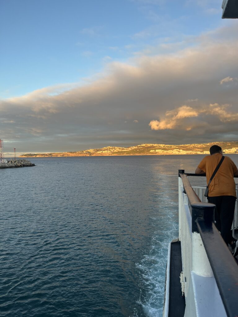 Veidi enne kella seitset avatigi check-in, kotid valgustati läbi, passid vaadati üle (aga templit veel ei antud) ja lõpuks lastigi laeva. Laev ise oli täitsa kena, küll mitte päris Hiiumaa Tiiu, pigem sinna Helsingi liinilaeva kanti, aga pisem. Teine korrus oli reserveeritud VIP-idele. Sättisin end sisse, panin telefoni laadima ja jäin ärevuses ootama. Viimased minutit Euroopas. Sõit algas kell 19 ja ka lõpes kell 19, sest ajavahe on täpselt tund. See tähendas aga päikseloojangu ajal linna jõudmist, vahetult enne hämardumist. Õnneks hostel asus vanalinna ääres kümneminutilise jalutuskäigu kaugusel sadamast, seega lootsin siiski jõuda enne pimedat öömajale. Kui praam lõpuks tuurid sisse võttis, ronisin välistekile vaatepilti nautima. Vaatasin korraks oma istmele ja lauale jäetud asju, sealhulgas seljakotti läpaka ja passiga ning kaalusin, kas on ikka mõistlik oma “maailma usaldamise” mõtteviisiga jätkata. Jõudsin järeldusele, et ma oleme kinnises laevas ja pealegi – enda ümber ringi vaadates ei näinud ma ühtegi inimest, keda varguses kahtlustada. Tavalised pered ja burkades vanamammid. Otsusasin asjad maha jätta. Ilm oli päikseline ja tuuline, rannik mõlemal kaldal mägine ja müstiline, meri hele-helesinine. Olin natuke pettunud, et mingit hirmus erilist tunnet ei tekkinud – õhk ei muutunud kõrbetuuleks ja kajakad ei kriisanudki araabia keeles. Poolel teel tõusis aga nii tugev tuul, et tekil vaadet piltistades hakkasin kartma telefoni minema lendamist. Ronisin vastu tahtmist tagasi laeva – näe, asjad kõik ilusti jätkuvalt olemas. Märkasin laeva keskel mingit luugiga letti, kus inimesed seisid pikas järjekorras. Algselt ei teinud ma sellest välja, arvates, et ju see on mingi kohalike protokoll. Siis aga märkasin, et kõikide dokumentidesse virutati templid sisse, ja muutusin rahutuks. Guugeldasin, et kus täpsemalt Marokosse merd mööda sisenedes viisatempel antakse, ning selgus, et just sellest samast putkast tulebki seda ise küsima minna. Täitsin ära passi vahel oleva infolipiku ning läksin järjekorda. Tempel käes nii kui niuhti!