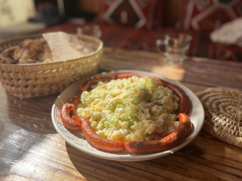 Lõpuks läksin üle vältimise ja ignoreerimise peale, sest see tundus ainuke viis kuidagi hostelieluga hakkama saada. Teisel nädalal tabas mind aga ootamatus, mille kohta ma ütleks, et keha tuli appi. Mu keha on tuntud selle poolest, et kui ma vaimselt end kehvasti tunnen, ilmnevad füüsilised sümptomid, millest pole võimalik enam mööda vaadata. Nagu ma olen kirjutanud, siis üritasin algselt igatpidi kohaliku ja hosteli eluga kohaneda, sh magamis- ja söögiaegadega. Umbes 9. või 10. päeval tabas mind järsku öösel terav valu ülakõhus. Proovisin juua vett, pöörata küll ühele ja teisele küljele, tõsta peaalust, võtta söetabletti, kuid tulutult. Sellist pussitavat valu polnud ma varem tundnud, mis käis lainetena ning pigistas mao krampi. Lõpuks võtsin sisse ühe Smecta, mis ravimikotis Oulust alates oma võimalust oli oodanud ning kõhuvalu tõmbus nii palju tagasi, et sain öösel magada. Hommikul väike valu siiski jätkus ning ma ei julgenud midagi süüa. Fatima pakkus esimese asjana, et äkki on asi joogivees, aga ma olin joonud meie filtreeritud vett, mis mingeid muresid ei tohiks tekitada. Teise süüdlasena pakkus ta odavat taimset õli, millega siin söögikordi valmistatakse ja mis ka temal endal seedimise tuksi keerab. Kallist oliiviõli keegi praadimisele ei kuluta. Mina ise kahtlustasin hoopis eksessiivset saiasöömist, mis iga toidukorra kõrvale käib. Otsustasin, et lõikan paariks päevaks kõik kohalikud toidud enda menüüst välja, söön ainult neutraalseid ja tuttavaid, võimalikult värskeid toiduaineid ning kui selle peale kõhuvalu taandub, hakkan lisama vaikselt nö ärritajaid. Minu uueks dieediks sai jogurt, mango, draakonvili ja kartulisalat. Just nimelt – kartulisalat, see minu enda lihavaba versioon õuna ja värske kurgiga. Või noh, algselt Merka emalt pärit, kuid aastatega minu firmaroaks kohandatud salat. See dieet tundus mu kehale kenasti sobivat, aga tekitas Mohamedis muidugi tuska – kui esimesel korral mainides tegi ta veel kaastundlikku nägu, siis edaspidi jätkas ta igal toidukorral küsimist, et miks ma nendega koos ei söö. Muidugi võib andeks anda, et võib-olla inimesel on halb mälu, aga miks ta iga kord veidi ärritunud minu toiduvalikutest oli, jääb sel juhul arusaamatuks. Lõpuks, kui kolme päevaga kõht jälle rahulikuks jäi, otsustasin naaseda tavapärase maroko toidu juurde selle erisusega, et saia enam toidu kõrvale ei söönud ehk siis läksin võtsin enne igat toidukorda endale lusika. Tegin seda võimalikult viisakalt ja diskreetselt, oodates kuni teised olid saiaga söömist alustanud ning tulin siis vaikselt enda lusikaga jaole. Keegi sellest mingit probleemi ei teinud ega uurinud, et miks ma lusikaga söön. Samuti ei tekitanud minu erisus teistes hostelikülastajates massilist soovi ka lusika järele haarata – jätkasid kõik rahulikult saia hävitamist. Olin paar päeva rahus nii toiminud kõigi pilkude all, kui Mohamed ühel päeval enne õhtusööki kamandas mind laua äärde nagu tavaliselt; mina selle peale, et jah, kohe, võtan oma lusika ja tulen, mille peale Mohamed vihastas: “Misasja, mis lusika? Siis tahavad kõik teised ka ju!” Ee, kuidas palun? Kuidas saab olla nii, et mitu päeva ei ole probleemi, aga vaat nüüd järsku on? Mul hakkas tekkima tunne, et tema ärritumised on rohkem minu kui minu “pattudega” seotud. Jätkasin oma lusikarevolutsiooni tema protesteerimisele vaatamata ja kõhumured sai lahendatud. Aeg-ajalt veel hommikuse omleti tomatikastme happelisuse peale sain kerget kõrvetust tunda, kuid põhisüüdlaseks jäid siiski tohutud saiakogused.