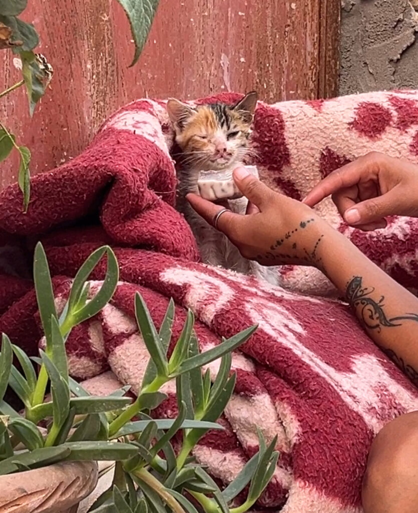 Ühel õhtul kõndisin pimedas hostelisse tagasi ja põrkasin ehmatades kodutänaval kokku ootamatu vaatepildiga. Kaks meest seisid rolleri kõrval, vaatasid maha ja rääkisid emotsionaalselt omavahel midagi araabia keeles. Lähemale jõudes märkasin maas raskelt hingavat imepisikest kassipoega, kelle suu ja nina olid verised ja kes turtsus haledalt. Igipõlise loomaarmastajana jooksin kõht sõlmes hostelisse ja edastasin Zahrale info mulle avanenud vaatepildist. Naine jooksis koheselt õue, tõstis oimetu viimasel hingusel oleva kiisu maja ees oleva tekihunniku otsa, kus tavaliselt meie kass Kim puhkas, ja asus teda läbi vaatama. Esikäpad tundusid olevat traumeerida saanud, pea samuti, kuid lülisammas oli siiski terve. Zahra pühkis beebi silmnäo puhtaks ja pani talle teki peale. Noh, rohkem polnud nagu midagi teha. Emir jooksis samuti õue uudistama ning nii me seal siis seisime kurvalt tema ümber. Meie Kim oli ekstreemselt häiritud sellest uuest räpakollist, kes tema aset hõivas, ning käis ja kõhises kassipoja peale. Pöidlad pihku, et kass öö üle elaks!