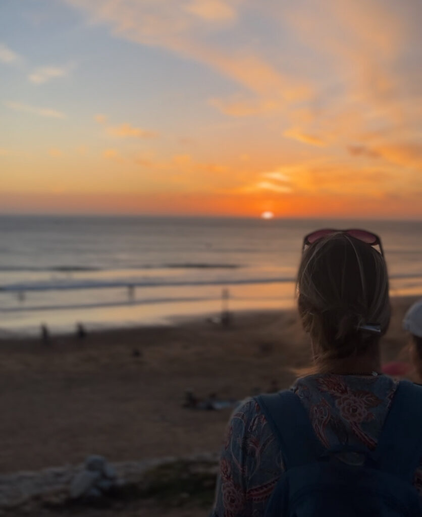 Sel pärastlõunal kutsus Zahra mind kaasa Taghazouti surfi expo’le. See pidi olema nädal aega kestev surfivõistlus koos väljanäituste, kontsertide ja erinevate töötubadega ning ma olin väga elevil, et seda kõike näha, kuid paraku ilma tõttu võistlusi ei toimunud – laineid lihtsalt polnud! See ei tähenda aga, et surfareid poleks olnud. Hüppasime siis rataste peale ja asusime väntama. Alguses mööda sõiduteed, kus sattusime korraks kokku ka Zahra sõpradega ning tiirutasime kõik koos autode vahel. Tamraghti ja Taghazouti vahel on väga mõnus uus asfalttee, mida ääristavad kaunid taimed, palmid, pingid ja peened hotellid. Varsti tegi Zahra järsu vasakpöörde hotellide vahelist kitsast teed mööda mereäärsele promenaadile. Tamraghti rannaäär on üliilusaks tehtud ning sealsetel laudteedel on võimalik kilomeetrite kaupa kulgeda. Lõpp läks minu jaoks küll raskeks, sest Zahra kihutas hirmsasti – tema oli ju harjunud seda teed iga päev sõitma, mina aga roostes rattaga, mis oli mulle liiga väike, ning üleüldse polnud mu reied harjunud enam rattasõiduga. Venisin aeglaselt ja sajatasin peas vaikselt Zahrat. Lisaks tõusudele ootasid meid ees trepid ning Zahrat tundus närvi ajavat, et ma lihtsalt rattaga treppidest alla ei sõitnud. Noh, ei huvita, mina surmasõitudega ei tegele. Lõpuks jõudsime Taghazouti peatänavale, kuid sealt oli vaja veel tolmuseid teid mööda Anchor Pointi jõuda. Ja vau, kus seal käis alles elu! Telgid püsti, muusika põntsus, laval DJ, seal samas liivarand ja ookean ning sillerdav päike. Parkisime rattad kahe palmi najale ning läksime uudistama. Väga ägedaid riideid, ehteid ja meeneid müüdi, kuid ohohoo, mis hinna eest. Marokos kleidi eest 50€ oskab ainult valge inimene küsida. Künka otsa mere äärde olid laotatud vaibad ja tekitatud istumisalad, kuhu me end mugavalt sisse sättisime. Onu saabus nagu tellitult münditeega ning jäime muusika rütmis õõtsuma. Vaatasin randa, võrkpalli kõksivaid turiste, keegi tegi liival joogat, sealsamas puhkasid kaks kaamlit. Väga idülliline vaatepilt. Zahra üritas mind tantsima meelitada, kuid niiviisi päise päeva ajal valges tundus natuke naljakas karglema hakata. Lubasin, et lähme, kui päike loojub. Ühel hetkel oli aga muusika juba nii bänger, et ma ei suutnud vastu panna, ja jooksimegi platsile. Lava ümbrus oli piiratud madalate metallväravatega, mille sees oli jube kitsas tantsida, seega lõime oma tantsuplatsi hoopis väravate kõrvale mere poole. Ja oh sa, kus me siis karglesime ringi! Nägin, et inimesed vaatasid meid ja ühel hetkel oli ka mingi kaamera mul näos, aga me ei lasknud end sellest heidutada. Milleks inimestele üldse alkohol ja narkootikumid? Mulle piisab päiksest, piparmünditeest ja heast mussist! Pidu, pidu, pidu!